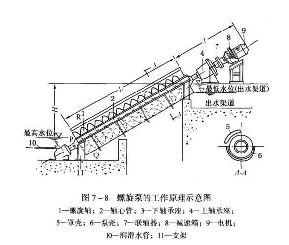 螺旋泵主要有螺旋部分、下部軸承、上部軸承、驅動裝置和泵槽等五個部分及附屬設備組成。